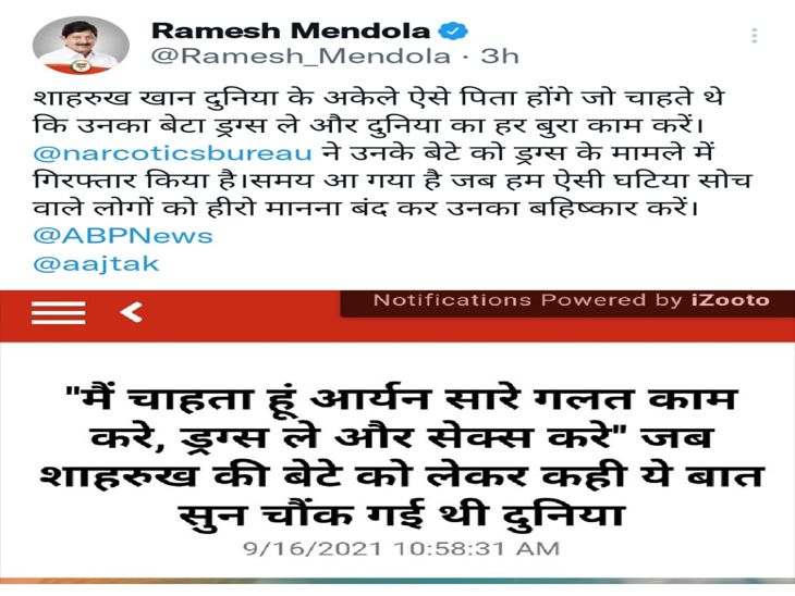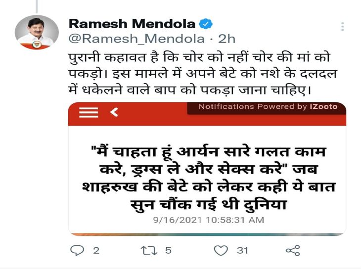 मेंदोला यही नहीं रुके उन्होंने आगे लिखा- पुरानी कहावत है कि चोर को नहीं, चोर की मां को पकड़ो। इस मामले में अपने बेटे को नशे के दलदल में धकेलने वाले बाप को पकड़ा जाना चाहिए। मैं यह मानता हूं कि ड्रग्स के इस मामले में आर्यन से ज्यादा दोषी उसके पिता शाहरुख खान है। जिस बाप ने खुद अपने बेटे को नशे के दलदल में गिराया हो यदि अभी उसे सजा देने का कानून नहीं है तो ये कानून बनाया जाना चाहिए।