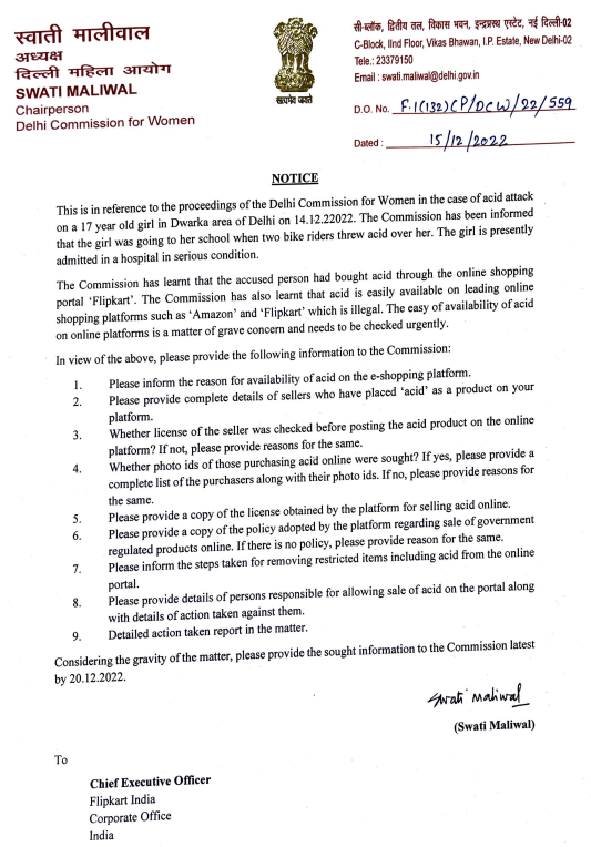 दिल्ली महिला आयोग (DCW) ने नोटिस में लिखा- जानकारी मिली है कि आरोपी ने तेजाब Flipkart से खरीदा था। सुप्रीम कोर्ट ने इस पर बैन लगा दिया था, लेकिन यह Amazon और Flipkart जैसे प्लेटफॉर्म पर आसानी से मिल रहा है। अपने प्लेटफॉर्म पर एसिड बेचने की वजह बताइए।