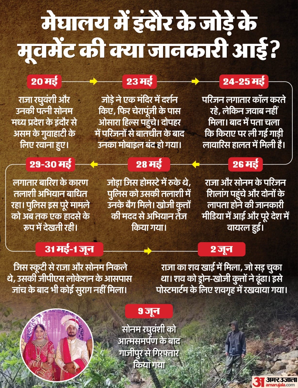 इससे पहले डीजीपी आई नोंग्रांग ने सोमवार सुबह बताया कि इंदौर के पर्यटक राजा रघुवंशी की हत्या कथित तौर पर मेघालय में हनीमून के दौरान उनकी पत्नी की ओर किराए पर बुलाए गए लोगों ने की। उन्होंने बताया कि पत्नी सोनम ने उत्तर प्रदेश के गाजीपुर में पुलिस के सामने आत्मसमर्पण कर दिया है, जबकि तीन अन्य हमलावरों को रात भर की छापेमारी में गिरफ्तार किया गया। दो को इंदौर (मध्य प्रदेश) से और एक को ललितपुर (उत्तर प्रदेश) से गिरफ्तार किया गया है।
