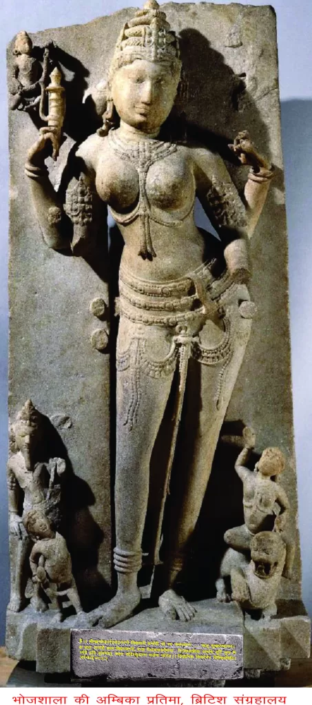 भोजशाला धार (मध्य प्रदेश) सन् 1875 में जब इमारत का जीर्णोद्धार किया जा रहा था तब वहाँ अंबिका और सरस्वती की दो प्रतिमाएँ पाई गई थीं। इनके पाए जाने के कुछ ही समय बाद एक मूर्तियों को विलियम किनकैड (भारतीय सिविल सर्विस) के ध्यान में लाया गया, जो 1866 से मध्य भारत में काम कर रहे थे। वह 1886 में भारत से लौटने पर एक मूर्ति को ब्रिटेन ले गये, और 1891 में इसे ब्रिटिश संग्रहालय के ऑगस्टस वोलास्टन फ्रैंक्स (1826-1897) के पास जमा कर दिया। जब किनकैड की 1909 में मृत्यु हुई, तो ये ब्रिटिश संग्रहालय का हिस्सा बन गई। ऐसा इन्टरनेट पर उपलब्ध सूचनाओं से ज्ञात होता है। दूसरी मूर्ति कब और कैसे ब्रिटिश संग्रहालय में पहुँची इसकी विस्तृत जानकारी नहीं है। उस प्रथम प्रतिमा के विषय में लिखा है कि- ‘‘धार की अंबिका मूर्ति ब्रिटिश संग्रहालय, लंदन के संग्रह में जैन देवी अंबिका की उच्च नक्काशी वाली पाषाण की प्रतिमा है।’’ दूसरी प्रतिमा वास्तविक वाग्देवी या सरस्वती की मूर्ति