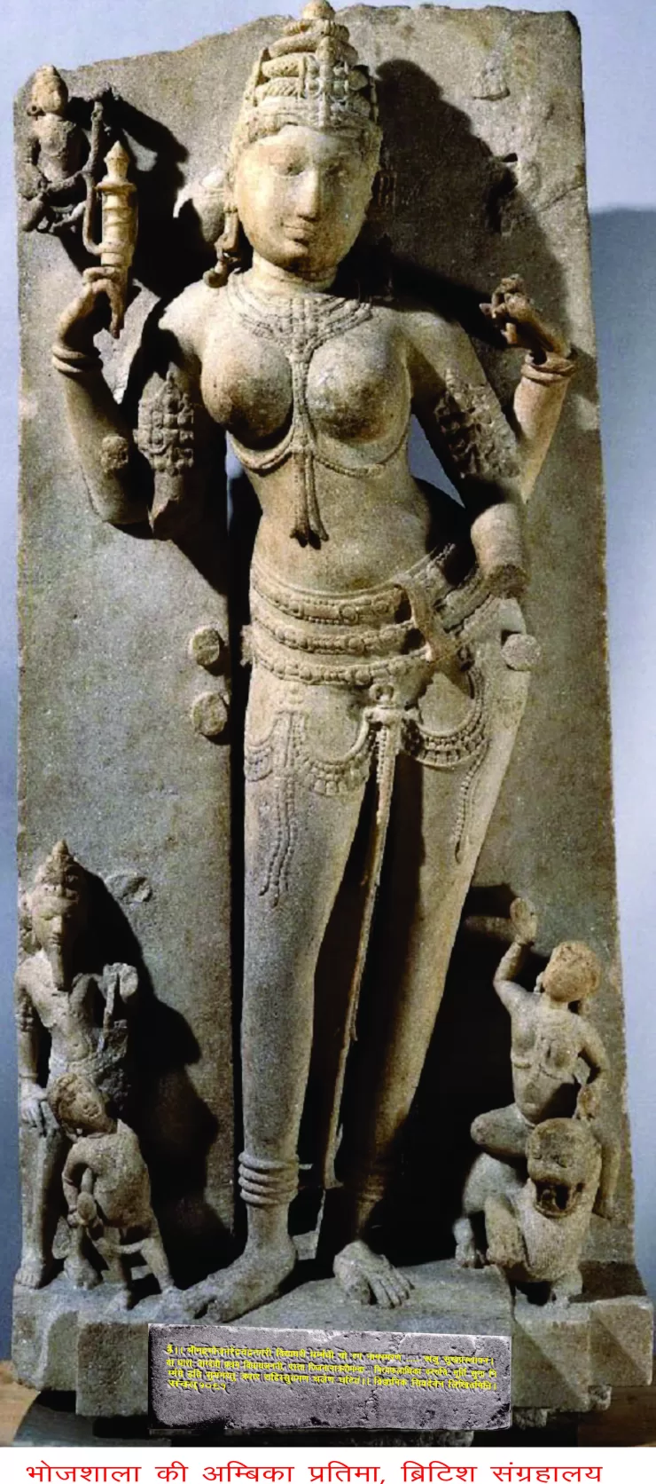 यह देवी एक सामान्य पादपीठी पर द्विभंगासन में खड़ी है, पैरों में भी चार-चार पैजनियाँ हैं। बायीं ओर अम्बिका का वाहन सिंह निर्मित है, जिसके ऊपर एक बालक या बालिका बैठी है, जो देवी की ओर निहार रही है और एक हाथ ऊपर को किये हुए है। दायीं ओर एक बालक कुछ पीछे को झुका सा खड़ा है, मानो वह भी उच्च दृष्टि करके माँ को निरख रहा हो, उसके एक हाथ में मातुलिंग फल है, दूसरा भग्न है। बालक के पीछे एक दाढ़ी वाले ऋषि हैं, ये मुकुटबद्ध हैं और अन्य आभारण भी धारण किये हुए हैं। इस अम्बिका देवी के पादपीठ पर अभिलेख है जो बहुत महत्वपूर्ण है। अभिलेख का पाठ इस प्रकार है-