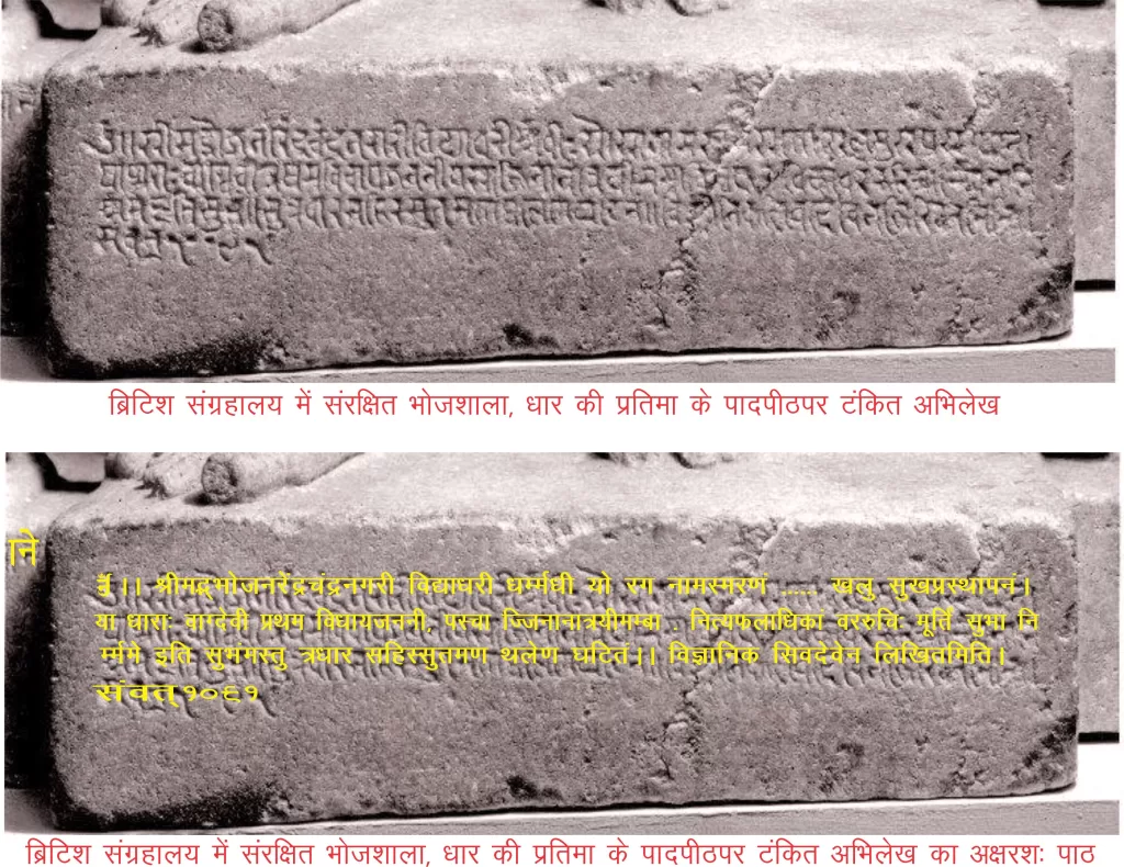 अर्थात्-‘‘संवत् 1091 में श्रीमद्भोज के चंद्रनगरी धारा में विद्याधरी जैन धर्म को धारण करने वाली जिनके नाम स्मरण से सुख की प्रस्थापना होती है, अज्ञानता को हटाने के लिए हैं, वररुची ने पहले वागदेवी माता और बाद में तीन जिनों का निर्माण करवाकर अम्बा की इस सुंदर छवि को बनवाया, जो हमेशा प्रचुर मात्रा में फल प्रदान करने वाली है, ये शुभ और कल्याणकारी हों। इसे सूत्रधार सहिर के पुत्र मणथल ने तराशा था है। यह लेख विशेष दक्ष शिवदेव द्वारा लिखा गया।’’