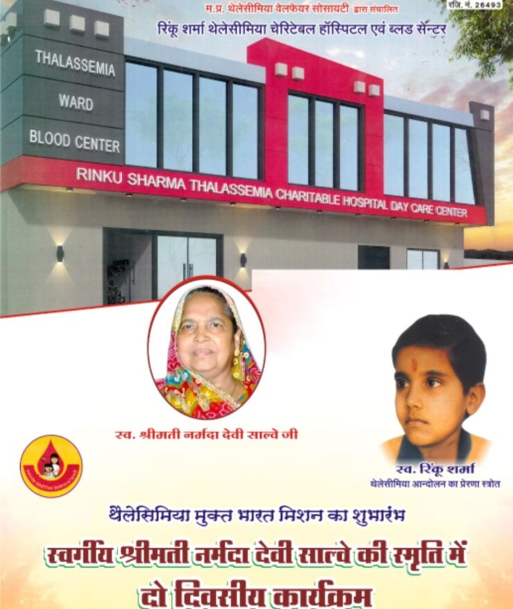 दो दिवसीय आयोजन स्वर्गीय नर्मदा देवी साल्वे की स्मृति में आयोजित किया जा रहा है।1 मार्च को थैलेसीमिया मुक्त भारत मिशन की शुरुआत होगी और 2 मार्च को थैलेसीमिया पीड़ित बच्चों की एच एल ए जांच जांच की जाएगी। इसी दिन समाजसेवी और मध्य प्रदेश शासन को सेवा देते हुए सेवा निव्रत हुए चैतन्य रघुवंशी का सम्मान भी किया जाएगा। थैलेसीमिया मुक्त अभियान में लगातार सहयोग करने वाली समाजसेवी श्रीमती शशि प्रभा बाकलीवाल, श्रीमती सरिता काला, श्रीमती श्वेता खनूजा और श्रीमती राजरानी जैन का भी सम्मान किया जाएगा । ।