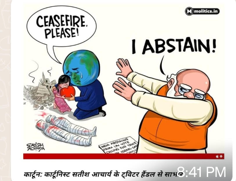 मिस्र के राष्ट्रपति से फोन पर चर्चा हुई, वो दिन शनिवार का था। उससे पहले वाले ही दिन यानी शुक्रवार को संयुक्त राष्ट्र महासभा में भारत ने उस प्रस्ताव पर नोटा कर दिया, जिसमें ठीक यही कहा गया था कि गाज़ा-इज़रायल के बीच फौरन, मानवतावादी कारणों से युद्ध विराम होना चाहिए! शुक्रवार को यह मांग मंजूर नहीं थी कि मानवतावादी युद्ध विराम होना चाहिए। और शनिवार को युद्ध का जारी रहना मंजूर नहीं था, फौरन शांति और स्थिरता की बहाली चाहिए थी। एक साथ शांति और युद्ध दोनों चाहिए। एक साथ दोनों मांगना, विश्व गुरु से कम किसी के बस की बात है क्या!