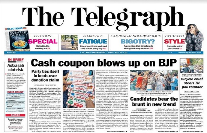 नकद कूपन से संबंधित खबर के अनुसार भाजपा ने दावा किया है कि ये चंदे की रसीद है और 1000 रुपए के “दान” के बदले जारी किए गए हैं। अखबार ने लिखा है कि गांव के लोग अगर भाजपा को 1000 रुपए “दान” कर सकते हैं तो पश्चिम बंगाल को मुख्यमंत्री ममता बनर्जी ने या तो पहले ही सोनार बांग्ला बना दिया है या फिर चुनाव प्रचारक नरेन्द्र मोदी की जादू की छड़ी ने पिछले कुछ हफ्तों में ऐसा किया है। कूपन पर प्रधानमंत्री की तस्वीर भी है। अखबार ने लिखा है कि तृणमूल कांग्रेस और माकपा आरोप है कि कूपन बांट कर समर्थन खरीदा गया है। यह भी आरोप है कि एक अप्रैल को प्रधानमंत्री की रैली में भाग लेने और भाजपा को वोट देने के लिए ये कूपन बांटे गए हैं। सच जो हो, खबर नहीं है यह ज्यादा महत्वपूर्ण है।
