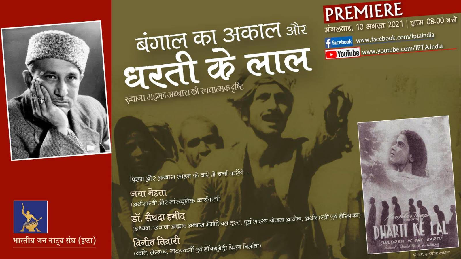 इस फ़िल्म पर हुई परिचर्चा का प्रीमियर 10 अगस्त 2021 को शाम 8 बजे से रात 10 बजे तक इंडियन पीपुल्स थियेटर एसोसिएशन (इप्टा) के फेसबुक पेज (iptaindia) और यूट्यूब चैनल (IPTA India) पर किया जाएगा। इस परिचर्चा में “धरती के लाल” और बंगाल के अकाल पर फ़िल्म के अनेक दृश्य दिखाकर और उनकी व्याख्या कर मुख्य प्रस्तुति देंगे प्रसिद्ध अर्थशास्त्री डॉ जया मेहता, कवि-लेखक विनीत तिवारी और इप्टा की संस्कृतिकर्मी सारिका श्रीवास्तव।