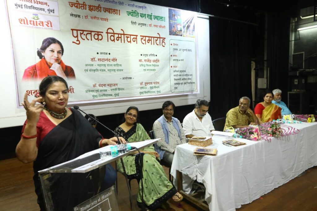 क्रांति ज्योति सावित्रीबाई फुले ने अपने जीवन में यह साबित कर दिखाया कि युग परिवर्तन कैसे किया जाता है। उनकी जलाई हुई ज्योति आज मशाल बन चुकी है। उनका जीवन हमेशा अनुकरणीय रहेगा। ये बातें प्रसिद्ध अभिनेत्री व रंगमंच अदाकारा शबाना आजमी ने गत 27 जुलाई, 2023 को मुंबई के कुसुमाग्रज मराठी भवन में प्रसिद्ध नाटककार, नाट्य निर्देशक तथा समीक्षक डॉ. सतीश पावड़े द्वारा लिखित मराठी नाटक ‘ज्योती झाली ज्वाला’ एवं इसका हिंदी अनुवाद ‘ज्योति बन गयी ज्वाला’ का लोकार्पण करते हुए कही।