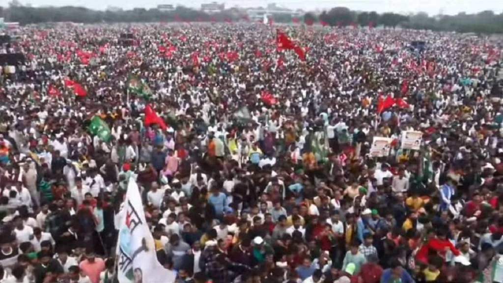 पटना। आज यानि 3 तारीख की सुबह से ही धीमी बारिश होने लगी थी। इसके बावजूद पटना के गांधी मैदान में लोगों का जुटान भी बढ़ने लगा। गांधी मैदान के दृश्य को देखकर ऐसा लग रहा था कि बिहार के उत्साह ने हर आंधी, बारिश, तूफ़ान को चुनौती दे दी है। गांधी मैदान में जन विश्वास यात्रा में राजद के साथ-साथ भाकपा-माले के कार्यकर्ता भी सुबह ही पहुंच गए थे। सुबह के वक्त पटना शहर और गांधी मैदान में सबसे ज्यादा झंडे भाकपा-माले का ही दिख रहा था। भाकपा-माने का लाल झंडा और राजद का हरा झंडा देखकर ऐसा लग रहा था कि हरा और लाल की जमीनी राजनीतिक ताकत संविधान एवं लोकतंत्र को खत्म करने वाली ताकत के खिलाफ निर्णायक जंग का ऐलान कर चुकी है।