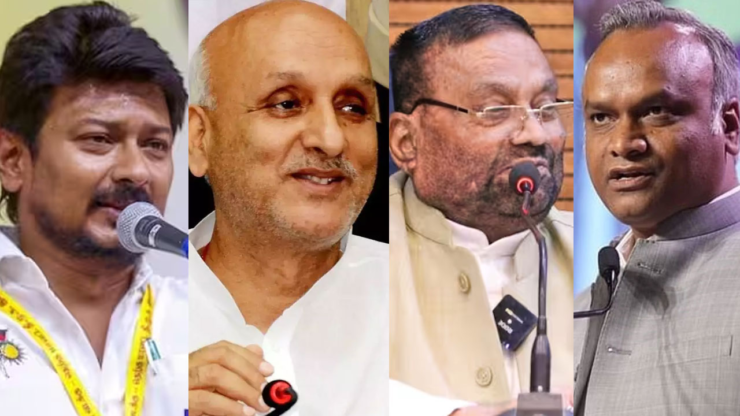 बाएं से उदयनिधि स्टालिन, चंद्रशेखर, स्वामी प्रसाद मौर्य, प्रियंक खरगे