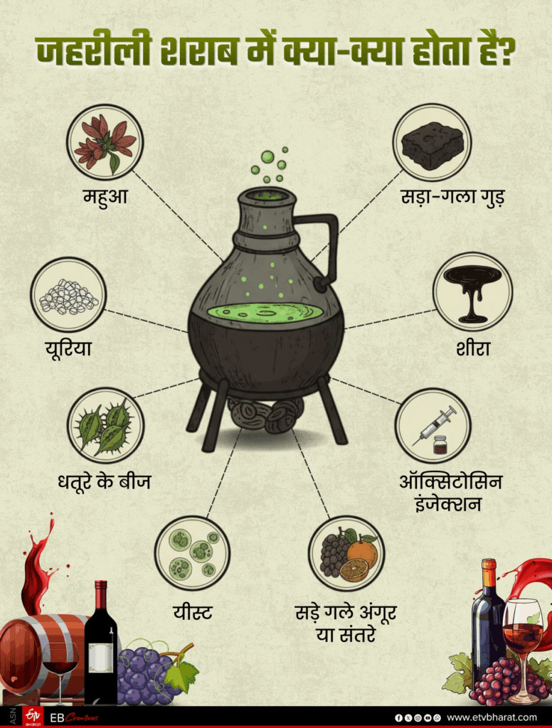 कच्ची शराब बनाने वाले अक्सर ग्राहकों की मांग पर नशा बढ़ाने के लिए खतरनाक रसायनों और धतूरे के बीज आदि की मात्रा बढ़ा देते हैं. लेकिन एक निश्चित मात्रा के बाद इन तत्वों से शराब जहरीली हो जाती है और इसके सेवन से मल्टीपल ऑर्गन फेलियर हो जाता है और व्यक्ति की जान चली जाती है. कई बार ये शराब लोगों के शरीर में स्लो पॉइजन का काम करती है और धीरे-धीरे मौत की ओर ले जाती है.
