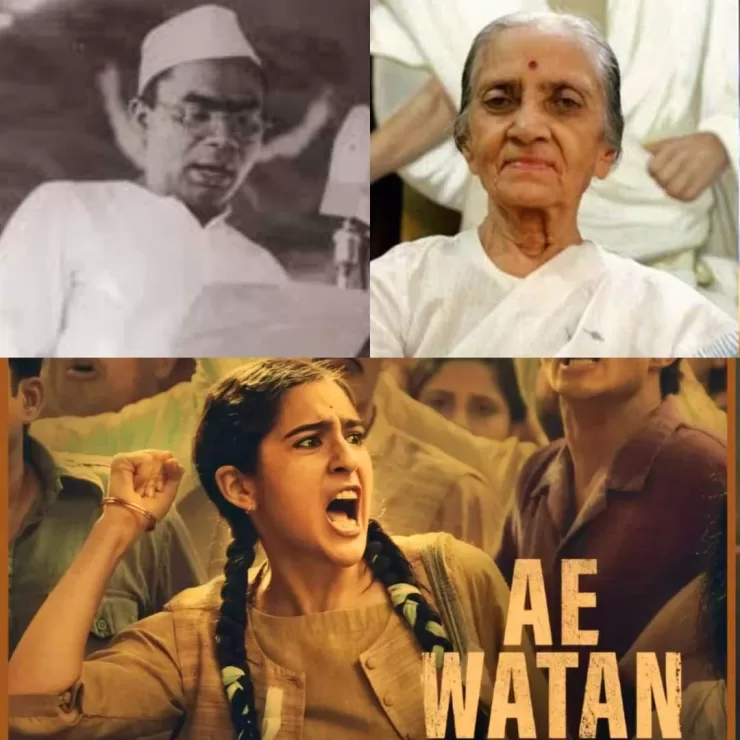 चित्र  : डॉ. राम मनोहर लोहिया, उषा मेहता और कांग्रेस रेडियो के इतिहास पर आधारित ‘ए वतन मेरे वतन’ फिल्म का पोस्टर।