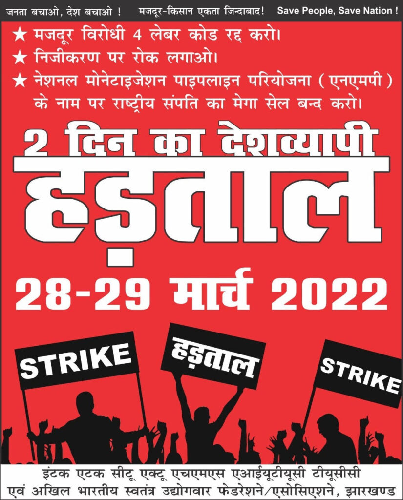 पहले किसानों ने देश की जनता और किसानों को बचाने के लिए एक वर्ष से ज्यादा धरना देकर आंदोलन किया था जिसमें 700 से ज्यादा किसान शहीद हुए थे। अब 28 29 मार्च 2022 को पूरे देश का मजदूर वर्ग यानी 90 फ़ीसदी से ज्यादा मजदूर वर्ग देशव्यापी हड़ताल पर जाने को मजबूर हुआ है। हड़ताल पर जाने वाले मजदूर और कर्मचारी संगठन पिछले काफी अर्से से सरकार की जन विरोधी, मजदूर विरोधी और कर्मचारी विरोधी नीतियों का विरोध कर रहे हैं और इन तमाम मजदूर, कर्मचारी वर्ग विरोधी नीतियों और कानूनों को वापस लेने की मांग कर रहे हैं।