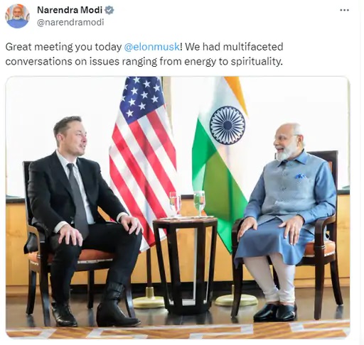 प्रधानमंत्री मोदी ने मस्क से मुलाकात के बाद तस्वीर ट्वीट करते हुए लिखा था, ‘आज आपसे शानदार मुलाकात हुई एलन मस्क। हमने ऊर्जा से लेकर आध्यात्मिकता तक के इश्यूज पर बातचीत की।’ मीटिंग से पहले कयास लगाए जा रहे थे कि एलन मस्क और PM मोदी मुलाकात के दौरान भारत में टेस्ला की एंट्री पर बात कर सकते हैं।