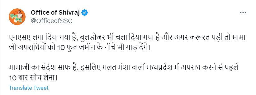 दरअसल, दिलीप मंडल नाम के एक यूजर ने ट्वीट किया था कि अगर इस केस में बुलडोजर नहीं चला तो यही माना जाएगा कि आपमें न्याय करने की क्षमता नहीं है और आप समदर्शी नहीं हैं। जिसके जवाब में सीएम शिवराज सिंह ने ये बात कही।