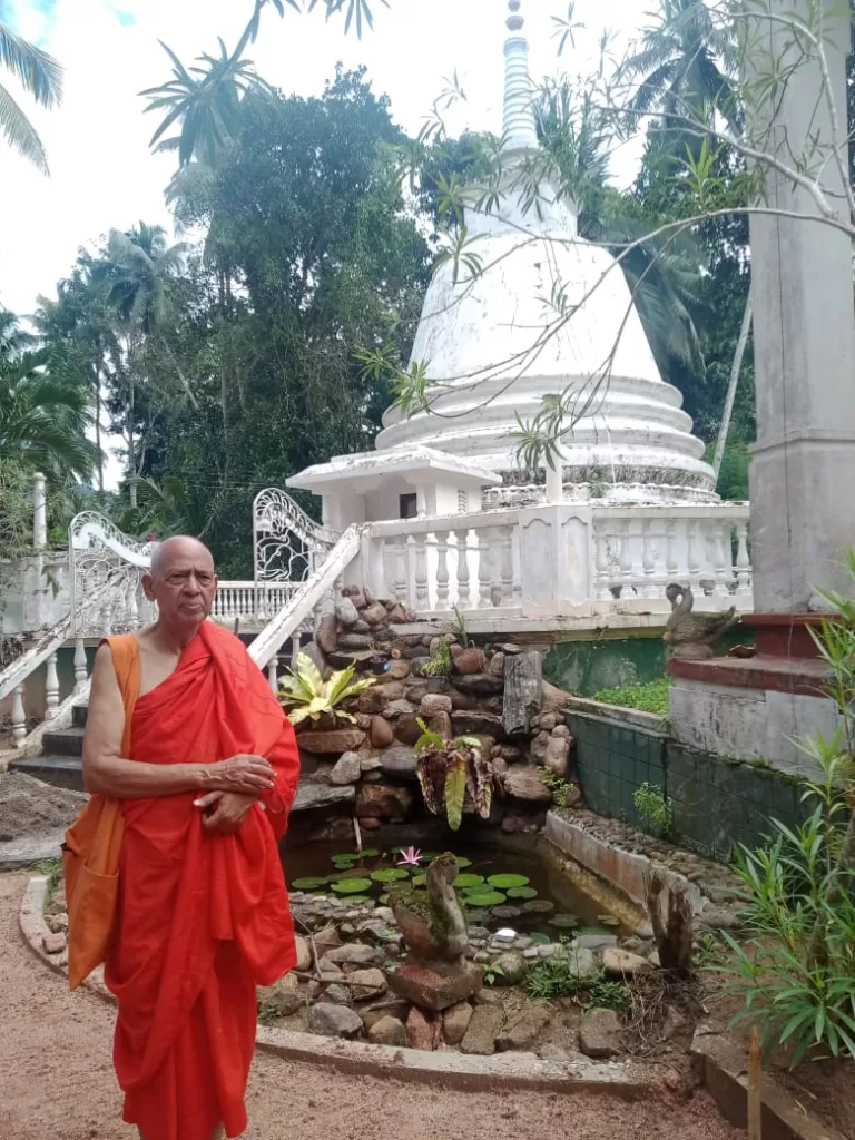खैर, श्रीलंका प्रवास के दौरान भंते सुगथानंद जी एक दिन अपनी कार से लगभग 150 किलोमीटर दूर अपने गांव ले गए। श्रीलंका के शहर से दूर-दराज गांव देखने का मेरा यह पहला अनुभव था। जैसा भारत में होता है– आधा गांव और आधा शहर। जगह-जगह कूड़े के ढेर, गंदगी और दूषित होता पर्यावरण। साथ ही बेतरतीब से बने नए-पुराने घरों की भरमार। लेकिन वहां लगता था कि जैसे प्रकृति की गोद में गांव बसे हों। खेतों में लहलहाती खेती, नारियल, अमरुद, कटहल, आम, चेरी अैर बटु सुधा आदि के पेड़ों से अनुपम सौंदर्य। एक तरफ पहाड़ी तो दूसरी ओर नदी। भंते जी के गांव में सभी घर पक्के थे। कहीं-कहीं घरों में रंगीन पेंट भी था, जो अति सुंदर लग रहा था। दीवारों पर तथागत के चित्र भी थे। लगभग 10 एकड़ में बना बौद्ध विहार भी उनके गांव में था। स्वयं भंते जी का बड़ा घर था। उसके चारों तरफ बाग-बगीचे। भंते जी के घर में तथागत की मूर्ति, टीवी, फ्रिज, सोफा सेट सभी कुछ था। मुझे देखकर उनके माता-पिता ने हाथ जोड़कर नमन किया और फिर मेहमानी की। परिवार के एक बच्चे ने आकर मेरे पांव छुए। वहां सोफों पर सफेद कपड़ा बिछाया जाता है। ऐसा श्रीलंका के अधिकांश घरों में परंपरा है। सफेद कपड़ा पुरुष अपने कंधे पर भी डालते हैं और महिलाएं सफेद साड़ी पहनती हैं।