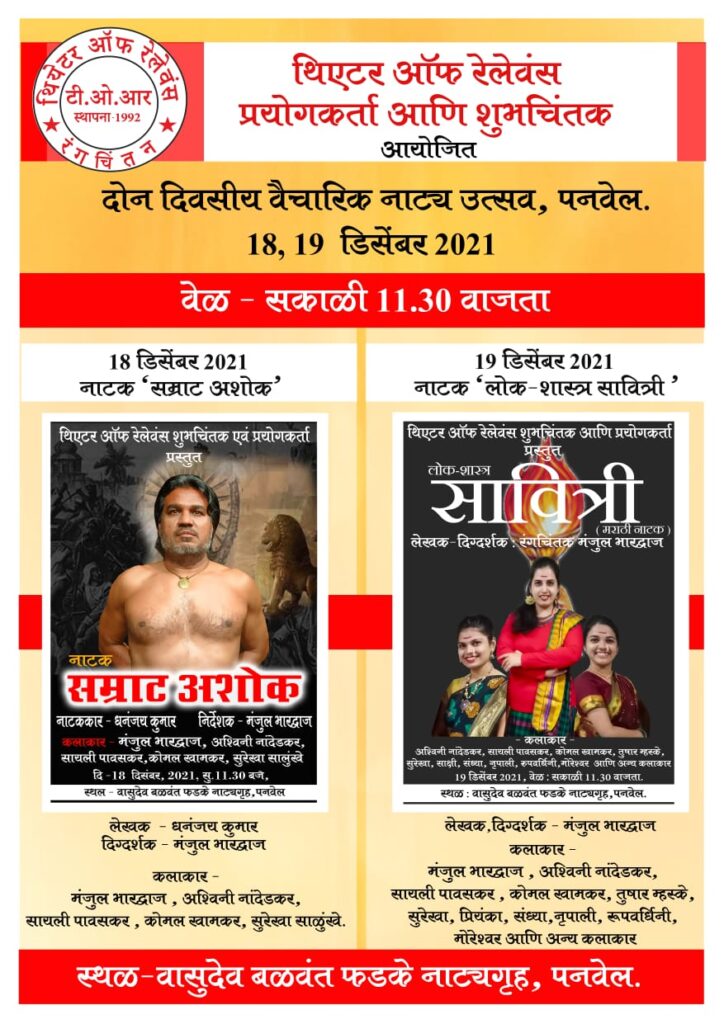 ‘थिएटर ऑफ़ रेलेवंस’ के सृजनकार मानवीय विवेक को आलोकित कर विचार की ज्योत प्रज्ज्वलित करने के लिए दो वैचारिक नाटक ‘सम्राट अशोक’ और ‘लोक-शास्त्र सावित्री’ 18-19 दिसम्बर, 2021 को सुबह 11.30 बजे,वासुदेव बलवंत फड़के नाटयगृह, पनवेल में प्रस्तुत करेंगे !
