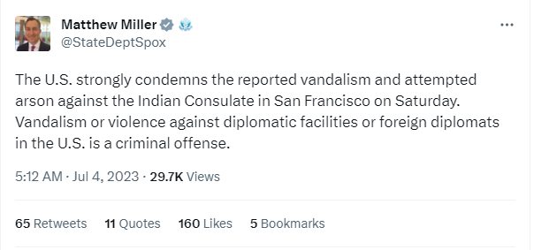 खालिस्तानी समर्थकों ने अमेरिका के सैन फ्रांसिस्को स्थित भारतीय दूतावास में आग लगाने की कोशिश की। सिख फॉर जस्टिस (SFJ) के प्रमुख आतंकी गुरपतवंत सिंह पन्नू ने 30 जून को कहा था कि 8 जुलाई से भारतीय दूतावासों को घेरेंगे। इसके ऐलान के अगले ही दिन यानी 1 जुलाई की रात को इस घटना को अंजाम दिया गया।