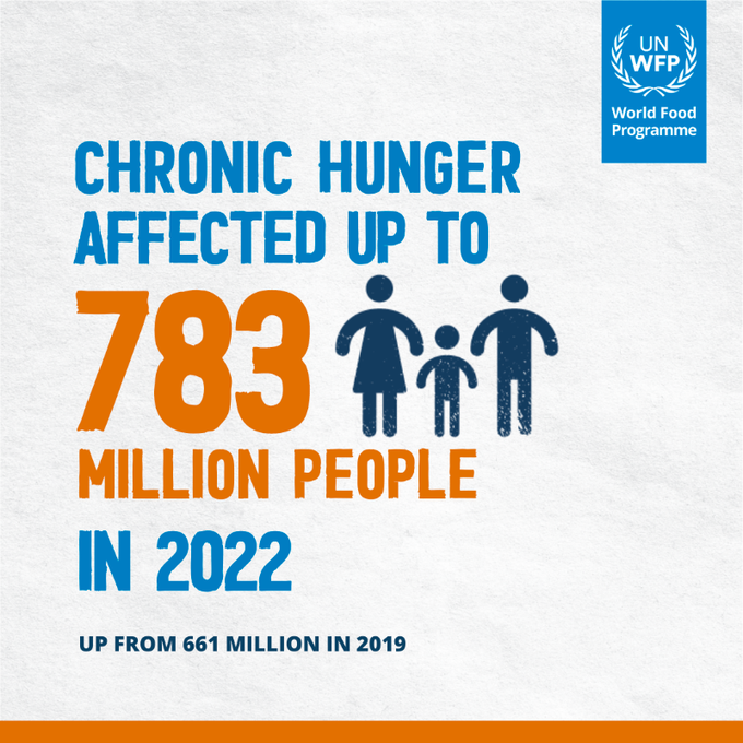 संयुक्त राष्ट्र की पांच एजेंसियों ने ‘खाद्य सुरक्षा एवं पोषण स्थिति रिपोर्ट 2023 में कहा कि 2021 और 2022 के बीच विश्व में भूखे लोगों की संख्या में कोई खास बदलाव नहीं हुआ लेकिन बहुत सी जगहों पर लोगों को गंभीर रूप से खाद्य संकट का सामना करना पड़ा।