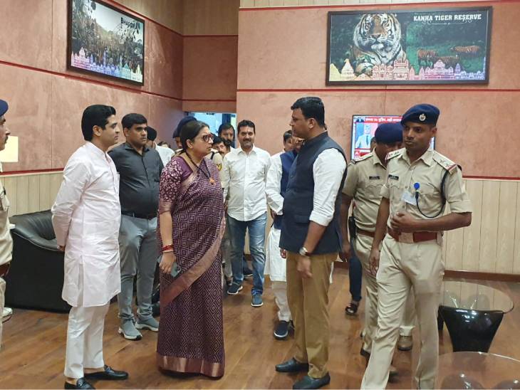 एयरपोर्ट के लाउंज में भाजपा नगर अध्यक्ष गौरव रणदिवे से चर्चा करती ईरानी।