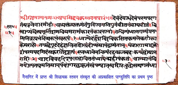 श्री दिगम्बर जैन तीर्थ क्षेत्र नैनागिरि (छतरपुर) म.प्र. में श्री सिद्धचक्र स्तवन की अप्रकाशित पाण्डुलिपि प्राप्त हुई है। जिसकी प्रति हमें क्षेत्र के यशस्वी अध्यक्ष सुरेश जैन (आईएएस) भोपाल ने उपलब्ध कराई है। 13 पृष्ठीय इस पाण्डुलिपि में काली और लाल स्याही का उपयोग किया गया है, प्रत्येक पृष्ठ में आठ पंक्तियाँ हैं, प्रतिपंक्ति 27 -34 अक्षर हैं। इसमें 38 संस्कृत श्लोक हैं, 22 स्रग्धरा छंद में, 11 शार्दूलविक्रीडित छंद, 2 मालिनी छंद 1 वसंततिलका और 1 श्लोक अनुष्टुप् छंद में है।