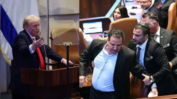 दोनों सांसदों के नाम ओफ़र कासिफ़ और अयमान ओदेह हैं.अयमान ओदेह ने ट्रंप के सामने नारेबाज़ी की और एक कागज भी दिखाया, जिस पर लिखा था- ‘फ़लस्तीन को मान्यता दो’.इसके बाद ओदेह पीछे बैठे कासिफ़ के पास चले गए. बाद में दोनों को इसराइली संसद क्नेसेट से बाहर निकाल दिया गया.