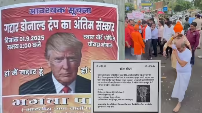 भोपाल में भारतीय गणवार्ता पार्टी ने अनोखा विरोध प्रदर्शन किया। ट्रंप के 50 प्रतिशत टैरिफ बढ़ाने के विरोध में भगवा पार्टी ने अमेरिकी राष्ट्रपति का पुतला जलाया। कार्यकर्ताओं ने तेरहवीं के कार्ड बांटकर शवयात्रा निकाली। अब 13 दिन बाद डोनांड ट्रप का मृत्युभोज भी होना है।