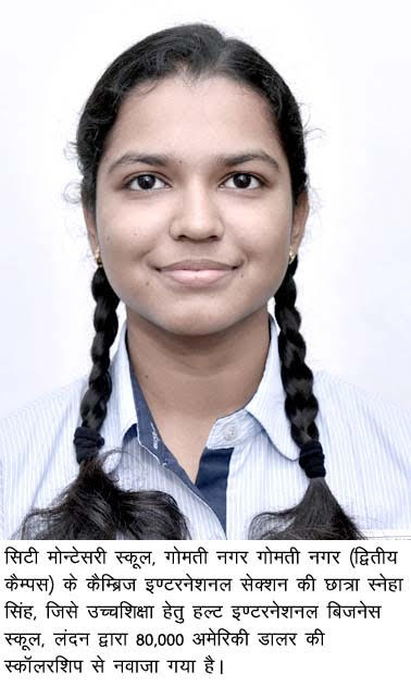 लखनऊ। सिटी मोन्टेसरी स्कूल, गोमती नगर (द्वितीय कैम्पस) के कैम्ब्रिज इण्टरनेशनल सेक्शन की छात्रा स्नेहा सिंह को उच्चशिक्षा हेतु इंग्लैण्ड के हल्ट इण्टरनेशनल बिजनेस स्कूल, लंदन एवं बोस्टन द्वारा फ्यूचर लीडरशिप स्कॉलरशिप एवं विजनरी वोमेन अवार्ड स्कॉलरशिप से नवाजा गया है, जिसके अन्तर्गत स्नेहा को विश्व के इस प्रतिष्ठित विश्वविद्यालय में चार वर्षीय बी.बी.ए. कोर्स हेतु 80,000 अमेरिकी डालर की स्कॉलरशिप प्रदान की जायेगी। उक्त जानकारी सी.एम.एस. के मुख्य जन-सम्पर्क अधिकारी श्री हरि ओम शर्मा ने दी है। श्री शर्मा ने बताया कि चूँकि सी.एम.एस. की यह छात्रा अन्तर्राष्ट्रीय स्तर पर ‘ए श्रेणी’ की विद्यार्थी है, ऐसे में इसका चार वर्षीय बी.बी.ए. कोर्स मात्र तीन वर्षो में पूरा हो जायेगा, साथ ही एक वर्ष की स्कॉलरशिप की राशि वह किसी अन्य मद में खर्च कर सकेगी। श्री शर्मा ने बताया कि स्नेहा प्रथम वर्ष का कोर्स लंदन के हल्ट इण्टरनेशनल बिजनेस स्कूल में पूरा करेगी जबकि शेष दो वर्ष का कोर्स बोस्टन में पूरा करेगी। सी.एम.एस. की इस प्रतिभाशाली छात्रा ने अपनी सफलता का सम्पूर्ण श्रेय सी.एम.एस. के अपने शिक्षकों व विद्यालय के शान्तिपूर्ण शैक्षिक वातावरण को दिया है। सी.एम.एस. संस्थापक डा. जगदीश गाँधी ने सी.एम.एस. छात्रा की सफलता पर हार्दिक प्रसन्नता व्यक्त करते हुए उसके उज्जवल भविष्य की कामना की है। श्री शर्मा ने बताया कि प्रतिवर्ष भारी संख्या में सी.एम.एस. छात्र विश्व के सर्वश्रेष्ठ विश्वविद्यालयों में उच्चशिक्षा हेतु चयनित होते हैं। इस वर्ष अभी तक सी.एम.एस. के 70 से अधिक छात्रों ने अमेरिका, इंग्लैण्ड, कैनडा, आस्ट्रेलिया, जापान, सिंगापुर, जर्मनी आदि विभिन्न देशों के ख्यातिप्राप्त विश्वविद्यालयों जैसे कैम्ब्रिज यूनिवर्सिटी, कैलीफोर्निया इन्स्टीट्यूट ऑफ टेक्नोलॉजी (कैलटेक), मैसाचुसेट्स इन्स्टीट्यूट ऑफ टेक्नोलॉजी (एम.आई.टी.), स्टेनफोर्ड यूनिवर्सिटी, कार्नेल यूनिवर्सिटी, मेलबर्न यूनिवर्सिटी एवं नेशनल यूनिवर्सिटी ऑफ सिंगापुर आदि में स्कॉलरशिप के साथ चयनित होकर लखनऊ का नाम रोशन किया है