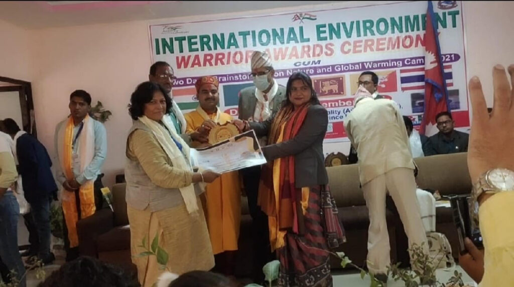 इस अवसर पर जगत विजन मासिक पत्रिका की संपादक विजया पाठक को पर्यावरण संरक्षण पर महत्वपूर्ण कार्य करने के लिए अंतर्राष्ट्रीय पर्यावरण योद्धा सम्मान 2021 से सम्मानित किया गया। यह सम्मान कार्यक्रम की मुख्य अतिथि श्रीमती सुषमा यादव राज्यमंत्री आर्थिक मामला तथा सहकारी मंत्रालय लुम्बनी नेपाल द्वारा दिया गया। गौरतलब है कि विजया पाठक ने बक्सवाहा के डायमंड बंदर प्रोजेक्ट से होने वाले विनाश और पर्यावरण में होने वाले नुकसान को जगत विजन पत्रिका में 40 पेज की कवर स्टोरी प्रकाशित कर उजागर किया था। विजया पाठक पूर्व में बेतवा बचाओ आंदोलन से जुड़कर महत्वपूर्ण कार्य कर चुकी हैं। साथ ही यह कई सामाजिक सरोकार से संबंधित आंदोलनों में सक्रिय योगदान दे चुकी हैं। विजया पाठक तीन दशक से सामाजिक कार्यकर्ता के रूप में काम कर रही हैं। बुंदेलखंड के बकस्वाहा प्रोजेक्ट में भी पर्यावरण संरक्षण को लेकर इन्होंने सक्रियता दिखाई है। इस अवसर पर विजया पाठक ने कहा कि यह सम्मान मेरे जैसे हजारों पर्यावरण संरक्षण पर कार्य करने वाले योद्धाओं के लिए प्रेरणा है, जिन्होंने निस्वार्थ भाव से प्रकृति के संरक्षण एवं संवर्द्धन के लिए अपने आप को समर्पित कर दिया है। आपको बता दें कि राज्य और केंद्र सरकार बक्सवाहा प्रोजेक्ट के तहत 2,15,875 पेड़ काटकर हीरा खनन करने पर उतारू हैं। यह परियोजना भयंकर विनाशकारी है। संघर्षशील विजया पाठक और अन्य पर्यावरणविदों की सक्रिय भूमिका के परिणामस्वरूप एनजीटी भोपाल एवं हाईकोर्ट जबलपुर ने इस परियोजना पर रोक लगा दी है।