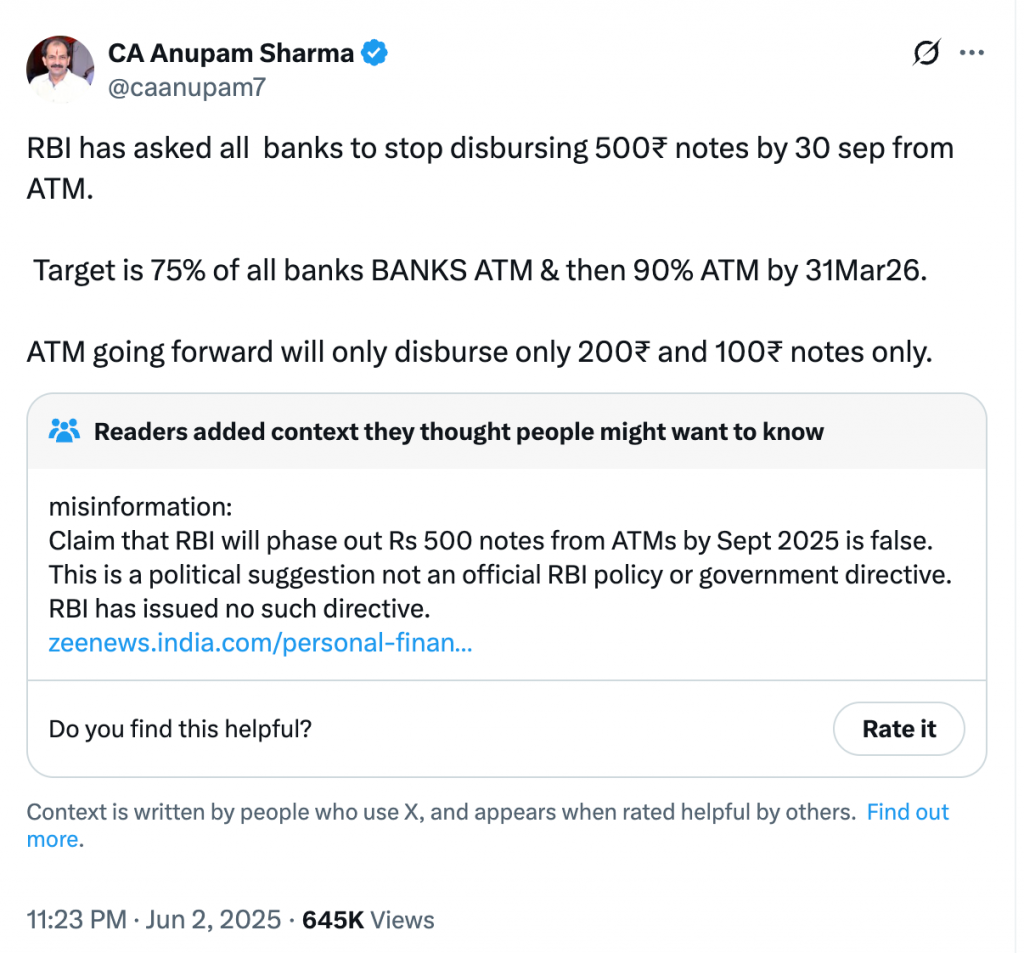 वेरिफ़ाइड X-यूज़र सीए अनुपम शर्मा, ए.के. मंधान, सीए पारस गंगवाल समेत कई X-यूज़र भी दावा कर रहे हैं कि RBI सितंबर 2025 तक ATM से 500 रुपये के नोट हटा देगा और आगे चलकर एटीएम से केवल ₹200 और ₹100 के नोट ही निकलेंगे.
