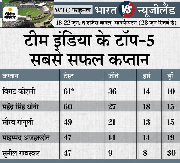 न्यूजीलैंड के खिलाफ वर्ल्ड टेस्ट चैंपियनशिप के फाइनल मैच में टॉस के साथ ही विराट कोहली ने महेंद्र सिंह धोनी का एक बड़ा रिकॉर्ड तोड़ दिया। विराट अब सबसे ज्यादा टेस्ट मैचों में भारत की अगुवाई करने वाले कप्तान बन गए हैं। उनकी कप्तानी में यह 61वां टेस्ट मैच है। धोनी ने 60 मैचों में भारत की कप्तानी की थी।