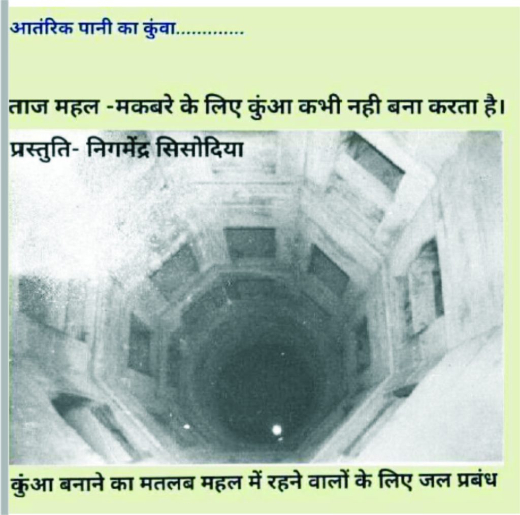 हमारे पास पुरुषोत्तम नागेश ओक द्वारा लिखित पुस्तक ‘‘ताजमहल हिन्दू राज-भवन था’’ का चित्र और उसके कुछ पृष्ठों के चित्रों व प्रकाशित तथ्यों के विवरण सुरक्षित हैं। जिनके प्रायः प्रत्येक पृष्ठ पर लिखा है- ‘‘प्रस्तुति निगमेन्द्र सिसोदिया’’। इसमें चित्र के साथ निम्नांकित विवरण है-- ताजमहल के शिखर पर त्रिशूल और कलश के चित्र। ताजमहल के शिखर पर कलश और त्रिशूल शिवजी का प्रतीक, यह सनातन धर्म का प्रतीक है। कोई भी इसे इस्लाम का प्रतीक सिद्ध नहीं कर सकता। 2. वैदिक ज्यामिति विधि से निर्मित छत। चित्र व टिप्पणी। 3. ताजमहल के निचने तल पर स्थित संगमरमरी कमरों का समूह.. ये राजा के महल के होने का प्रमाण है। इतने विशाल कमरे क्या मुर्दों के लिए कोई बनाता है? जब मकबरे में किसी को रहना नहीं था तो कोई कमरे क्यों बनाएगा? 4. आन्तरिक पानी का कुआँ। कुआँ बनाने का मतलब महल में रहने वालों के लिए जल प्रबंध। 5. दीवारों पर बने हुए फूल, जिनमें छुपा हुआ है ‘ओम्’। 6. दुनिया में किसी भी मुस्लिम इमारत को महल नहीं कहा जाता। 7. चित्र दरवाजे इंटों से बंद। टिप्पणी- पुरुषोत्तम नागेश ओक की खोज से डरकर इंदिरा गंधी द्वारा बहुत से साक्ष्यों को छुपाने के लिए, ईटों से बंद किया गया दरवाजा। कोई पूछे मकबरे में ये गुप्त कमरे बनाने का मकसद क्या होता है। 8. प्रवेश द्वार पर बने लाल कमल…। कोई मुस्लिम सनातन धर्म प्रतीक कमल फूल को नहीं बनाता। 9. ताज महल में वैदिक शैली में निर्मित गलियारा। 10. पीछे की खिड़कियां और बंद दरवाजों का दृश्य। इतने विशाल खिड़की दरवाजे किसी राज-महल के कमरों के लिए बनते हैं।