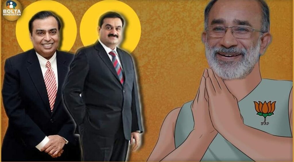 यहां सवाल उस – एक और – “नयेपन” का है, जो मोदी राज की नत्थी पहचान बन कर सामने आया है। 1956 में लिखी एक किताब में देश के तब के एक बड़े पूंजीपति ने आह-कराह के साथ लिखा था कि “भारत की जनता पूंजीपतियों को अच्छी नजर से नहीं देखती — उसकी नजरों में पूंजीपति ऐसे धूर्त तिकड़मी हैं, जो सरकारों के साथ मिलकर बेईमानी करते हैं, मजदूरों का शोषण करते हैं, जनता को लूटते हैं।” उन्होंने अपने बिरादर पूंजीपतियों से इस खराब छवि को सुधारने के लिए कुछ करने के लिए कहा था। पूंजीपतियों के प्रति जनता का यह तिरस्कार भाव ही था कि के के बिड़ला अपने गृह जिले झुंझनू से और नवल टाटा अपने घर तब की बम्बई की सीट से लोकसभा का चुनाव लड़े, तो बुरी तरह हारे। बहरहाल पूँजीपतियो ने तो अपनी आदतें सुधारने के लिए नाखून तक नहीं कटाये। भाजपा जरूर पूरी निष्ठा के साथ उनकी छवि चमकाने में लग गयी। तेरह दिन की सरकार में संसद में विश्वास प्रस्ताव पर चर्चा के आख़िरी दिन भोजनावकाश के दौरान अमरीकी कम्पनी एनरॉन के साथ हुए करार से शुरू हुयी अटल सरकार अगले कार्यकाल में बालको के बिक्री घोटाले से होती हुई टेलीकॉम के सर्वनाश तक गयी। वर्ष 2014 में पहली बार प्रधानमंत्री बनने के बाद अपने घर आये मोदी की पीठ पर हाथ रखे मुकेश अम्बानी की तस्वीर से हुयी अगली शुरुआत वाशिंगटन में वित्त मंत्राणी निर्मला सीतारमण के “भारत को पूंजीपतियों का सम्मान करने वाला देश” बताने से होते हुयी उनकी पूजा करने के सदुपदेश तक आयी है और यहीं तक रुकने वाली नहीं है।