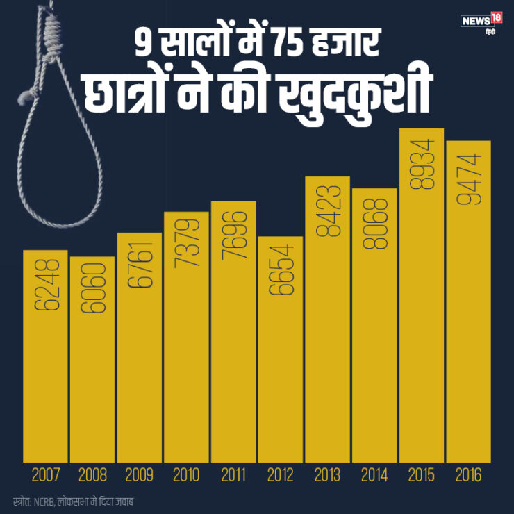 नेशनल क्राइम रिकॉर्ड्स ब्यूरो की एक्सीडेंटल डेथ्स एंड सुसाइड इन इंडिया रिपोर्ट से पता चलता है कि आत्महत्या से छात्रों के मौत की संख्या में 4.5 प्रतिशत की वृद्धि हुई, जिसमें महाराष्ट्र में सबसे अधिक मौतें हुईं, इसके बाद मध्य प्रदेश और तमिलनाडु का स्थान रहा। रिपोर्ट के मुताबिक, पिछले पांच वर्षों से छात्रों की आत्महत्या के मामले लगातार बढ़ रहे हैं। छात्रों में आत्महत्या के बढ़ते मामलों के पीछे कारणों में बेरोजगारी दर बहुत अधिक है। सिक्किम में, राज्य की लगभग 27% आत्महत्याएँ बेरोजगारी से संबंधित थीं और 21 से 30 वर्ष की आयु के बीच सबसे आम पाई गईं। परीक्षा केंद्रित शिक्षा से भारत में छात्रों की आत्महत्याओं में अंक, अध्ययन और प्रदर्शन के दबाव के साथ अकादमिक उत्कृष्टता की तुलना करना महत्वपूर्णकारक हैं।