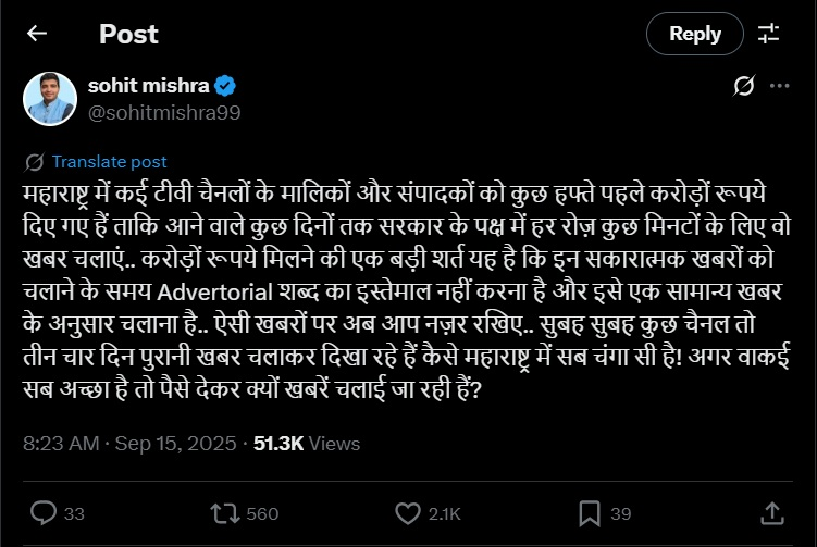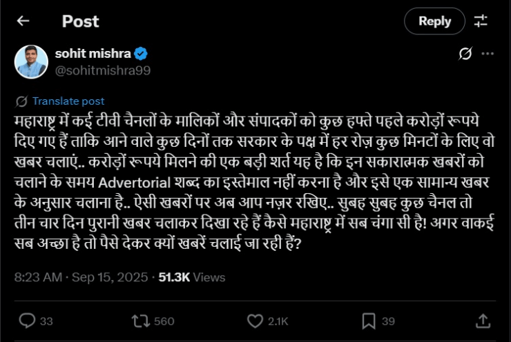 महाराष्ट्र में कई टीवी चैनलों के मालिकों और संपादकों को कुछ हफ्ते पहले करोड़ों रुपये दिए गए हैं ताकि आने वाले कुछ दिनों तक सरकार के पक्ष में हर रोज़ कुछ मिनटों के लिए वो खबर चलाएं..