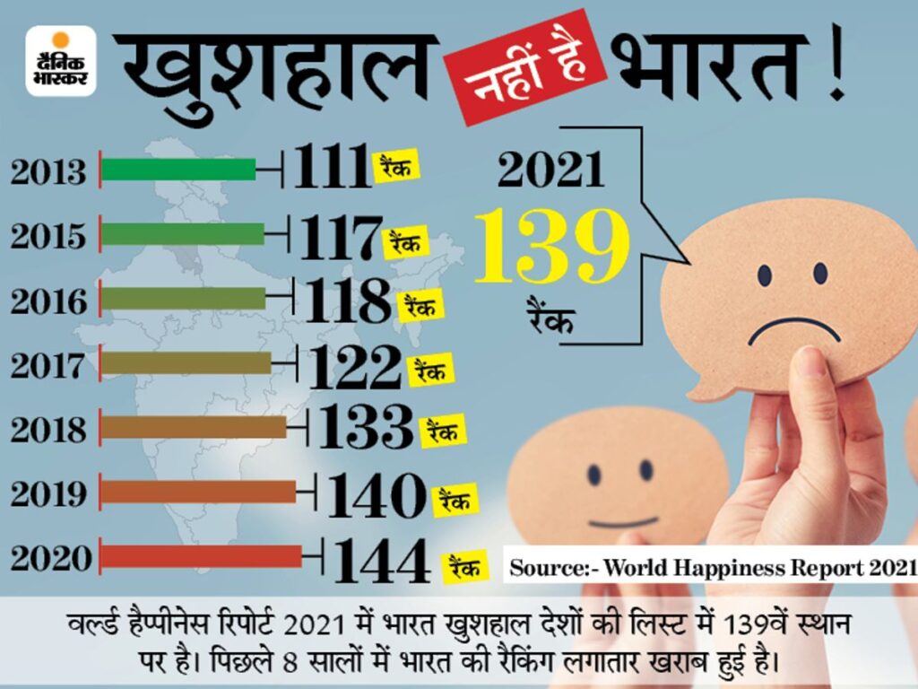 किसी भी देश की जनता या वहाँ का समाज तभी खुश रह सकता है,जब वह अपने वर्तमान समय में हर तरह से सुखी हो,आत्मसंतुष्ट हो और अपने भविष्य के प्रति किसी भी प्रकार से आशंकित या सशंकित न हो,आज भारत के लोगों में वर्तमानसमय के सत्ता के कर्णधारों की दुर्नीतियों और गलत नीतियों से उपर्युक्तवर्णित ये दोनों चीजें बिल्कुल सिरे से गायब हैं,आज भारत की समस्त जनता अपने वर्तमान जीवन की दुरूहताओं और परेशानियों से दुःखी,परेशान और निराश है तथा मानसिक रूप से बेहद तनाव में तो है ही,अपने भविष्य के प्रति भी बुरी तरह से भयाक्रांत और डरी हुई है। वर्ल्ड हैप्पीनेस रिपोर्ट 2022 के अनुसार दुनिया में शीर्ष पर रहनेवाले देशों जैसे फीनलैंड,नार्वे,स्वीडन,डेनमार्क आदि देशों में वहाँ की सरकारें अपने लोगों के जीवन का रास्ता सुगम और आरामदेह बनाने के लिए भरसक और अधिकतम प्रयत्नशील हैं,उदारणार्थ उन देशों में हफ्ते में केवल 5 दिन का कार्यदिवस और प्रतिदिन सिर्फ 4 घंटे का ही कार्य का समय होता है,कार्यस्थल पर वातावरण सभी कर्मचारियों और अधिकारियों के लिए हर तरह से आरामदायक और उनकी शारीरिक व मानसिक क्षमता के अनुरूप होता है। इन खुशहाल देशों में भविष्य में काम की गारंटी,बुढ़ापे में सुखी जीवन की सुनिश्चिंतता के लिए पेंशन मिलने की पूर्ण गारंटी,छुट्टियों की सुविधा और वेतन इतनी ज्यादे कि वहाँ के सभी लोग अपना जीवन खूब बढ़िया ढंग से जीते हैं,कोई भ्रष्टाचार नहीं,कोई रिश्वत नहीं, कोई जातिवादी वैमनस्यता नहीं,कोई धार्मिक कटुता से दंगे-फसाद नहीं,कोई मॉबलिंचिंग नहीं,वहां के किसान अपनी फसलों की जायज कीमत पाते हैं,अपवाद स्वरूप किसान को खुले बाजार में उनकी फसल की कीमत उस फसल के लागतमूल्य से कम मिलती है,तो उस स्थिति में वहाँ की सरकारें सब्सिडी के रूप में स्वयं उनकी भरपाई किसानों को कर देतीं हैं,इसीलिए वहाँ अपनी फसल की साल-दर-साल उचित मूल्य न मिलने की स्थिति में एक भी किसान खुदकुशी को बाध्य नहीं किया जाता ! वहाँ अपने बच्चों की शिक्षा,स्वास्थ्य और रोजगार के लिए कोई भी अभिभावक परेशान नहीं है,वहाँ शोषण के लिए एक भी पब्लिक स्कूल मतलब प्राइवेट स्कूल नहीं हैं,वहाँ के सभी बच्चे हर सुख-सुविधा से सम्पन्न सरकारी स्कूलों में लगभग निःशुल्क या नाममात्र की फीस में और पौष्टिक और स्वच्छ आहार के साथ प्राइमरी से 12 वीं तक की कक्षाओं में पढ़ते हैं। उसके बाद भी उच्च शिक्षा संस्थानों में फीस इतनी ही निर्धारित की जाती है कि वहाँ हर बच्चे उच्च शिक्षा भी प्राप्त कर लें। वहाँ हर छात्र को ऐसी तकनीकी या उपयोगी शिक्षा दी जाती है कि वे अपनी शिक्षा पूर्ण करते ही किसी न किसी रोजगार में लग जाते हैं। वहाँ की सरकारें अपने हर नागरिक की अच्छी शिक्षा,अच्छे स्वास्थ्य और रोजगार की स