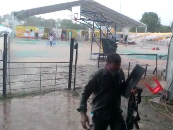 गुरुवार दोपहर करीब 3 बजे से आंधी के साथ शुरू हुई बारिश ने यहां पर कीचड़ कर दिया था। तेज हवा के कारण यहां लगे डोम फट गया और पानी गिरने से कंम्यूटर सहित पूरा सामान भीग गया। हवा में पत्तों की तरह उड़े टेंट जगह-जगह से फट गए। आंधी और पानी ने नेहरू स्टेडियम का नजारा ही बदल दिया।यहां बिछी कालीन भीग चुकी थी और वैक्सीनेशन के लिए यहां रखा गया सामान पानी-पानी हो गया था। बारिश के थमने के बाद जिम्मेदार अधिकारी मौके पर पहुंचे और इस फिर से ठीक करने में जुट गए।
