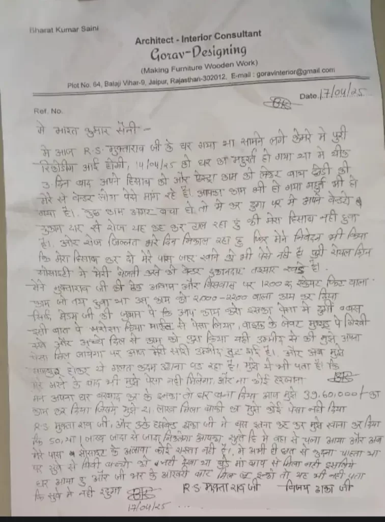 यह सुसाइड नोट भारत कुमार सैनी ने अपनी कंपनी के लेटर पैड पर लिखा। उसमें लिखा है कि ‘मैं भारत कुमार सैनी। आज आरएएस मुक्ता राव के घर गया था। सामने लगे कैमरे में पूरी रिकॉर्डिंग आई होगी। 14 अप्रैल को घर (आरएएस का घर) का मुहूर्त हो गया था। मैंने ठीक 3 दिन बाद अपने हिसाब और एक्स्ट्रा काम को लेकर बात छेड़ी। मेरे से वेंडर लोग पैसे मांग रहे हैं। आपका काम भी हो गया है। मुहूर्त भी हो गया है। कुछ काम बचा हो तो मैं कर दूंगा। मैं अपने वेंडरों दुकानदार को रोज यह कह कर टाल रहा हूं कि मेरा हिसाब नहीं हुआ है। रोज जिल्लत भरे दिन निकाल रहा हूं। फिर मैंने निवेदन भी किया कि मेरा हिसाब कर दो। मेरे पास जहर खाने को भी पैसे नहीं है। पूरी रॉयल ग्रीन सोसाइटी में मेरी बेइज्जती करने के लिए वेंडर दुकानदार तैयार खड़े हैं।