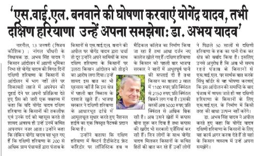 उन्होंने कहा कि डॉ अभय यादव के बयान से यह स्पष्ट है की दक्षिण हरियाणा की जनता को की गई मेरी वीडियो अपील से बीजेपी बौखला गई है। शायद विधायक जी को यह पता नहीं की एसवाईएल के मुद्दे पर मैं आज नहीं, पिछले 15 वर्ष से सक्रिय हूं। वर्ष 2005 में स्वर्गीय देवेंद्र सिंह यादव जी के नेतृत्व में हम लोगों ने “संपूर्ण क्रांति मंच, हरियाणा” के तत्वावधान में पंजाब और हरियाणा के किसानों और बुद्धिजीवियों की बैठक कर इस मुद्दे का समाधान सुझाया था। तब से अब तक मैं लगातार लिख और बोल कर इस मुद्दे को उठाता रहा हूं और इसे सुलझाने का प्रस्ताव देता रहा हूं। उस प्रस्ताव पर न तो कांग्रेस की सरकारों ने कान दिया और न ही भाजपा ने। इतने सालों तक अपनी अकर्मण्यता को ढकने के लिए अब वे पलट कर हमसे सवाल करें, इससे हास्यास्पद क्या हो सकता है। ज्ञात हो कि कल दिए अपने बयान में नांगल चौधरी के विधायक ने कहा था कि ‘योगेंद्र यादव एसवाइएल कनाल बनवाने की घोषणा करवाएं, तभी दक्षिण हरियाणा उन्हें अपना समझेगा।”